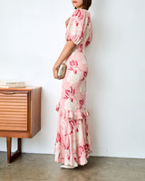 「裾をやや引きずる丈感です。胸元のあきは控えめだと思います」