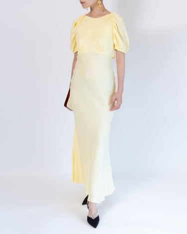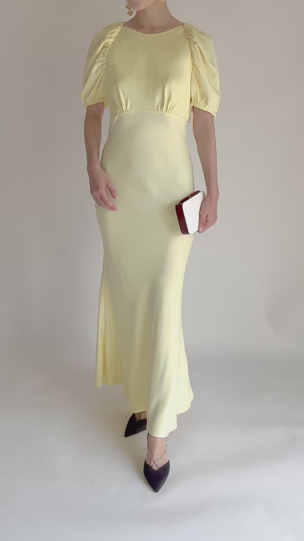 クレープサテン ギャザード パフスリーブ カットアウトドレス(S~小さめM相当)