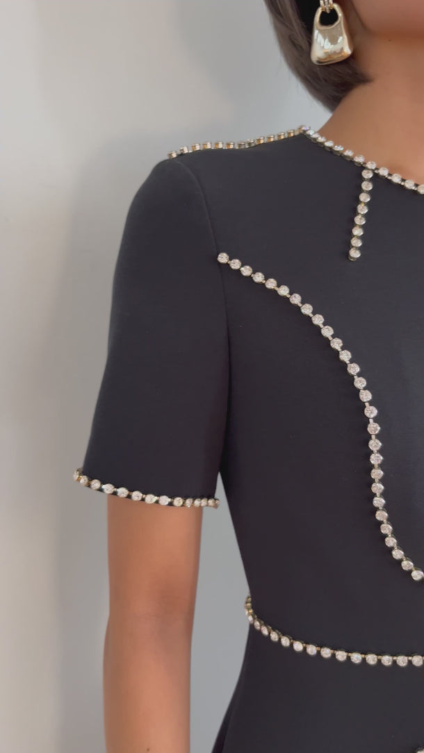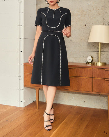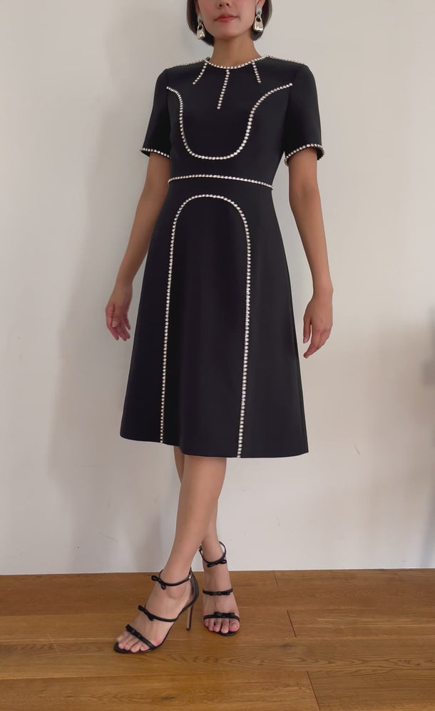 ロンドン発のラグジュアリーブランド、Huishan Zhang(フーシャン・ツァン)のひざ下丈ドレス。シンプルなブラックのフィット&フレアドレスに大粒クリスタルが大胆なアクセント。トロンプルイユ風のライン装飾は手作業で施され、さりげない遊び心が魅力です。厚手の最高級生地にシルク裏地で着心地も抜群。エレガントに差をつけたい方におすすめ。