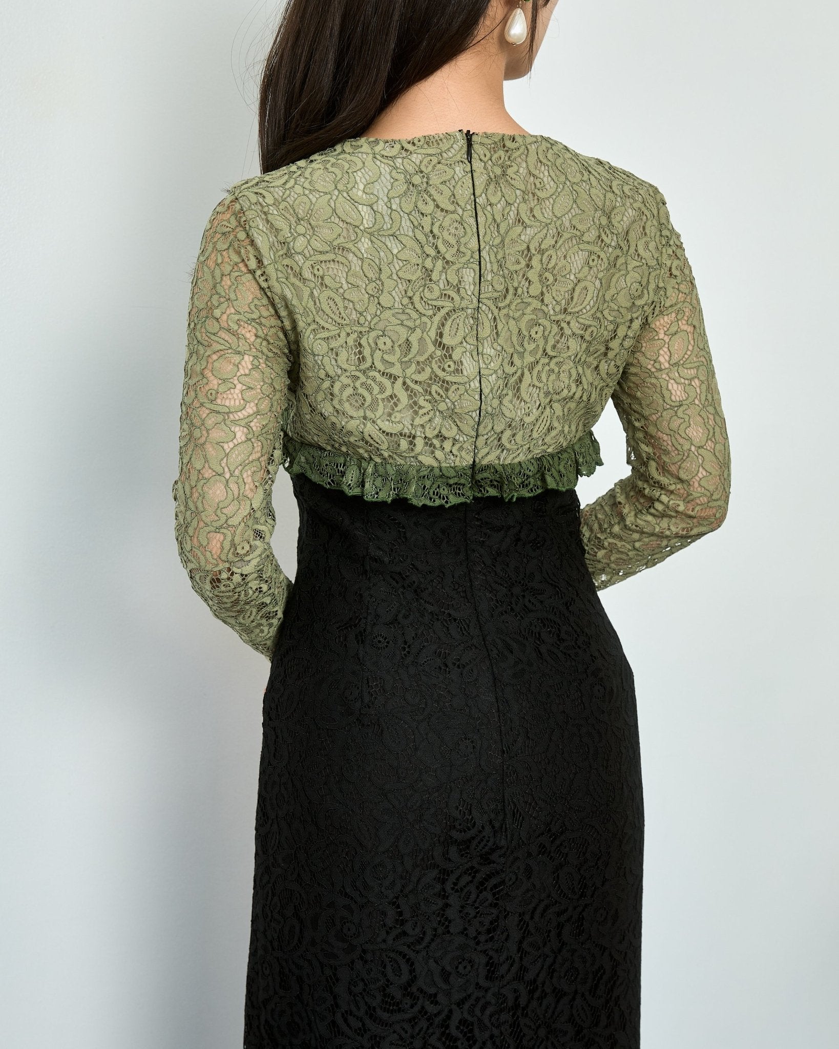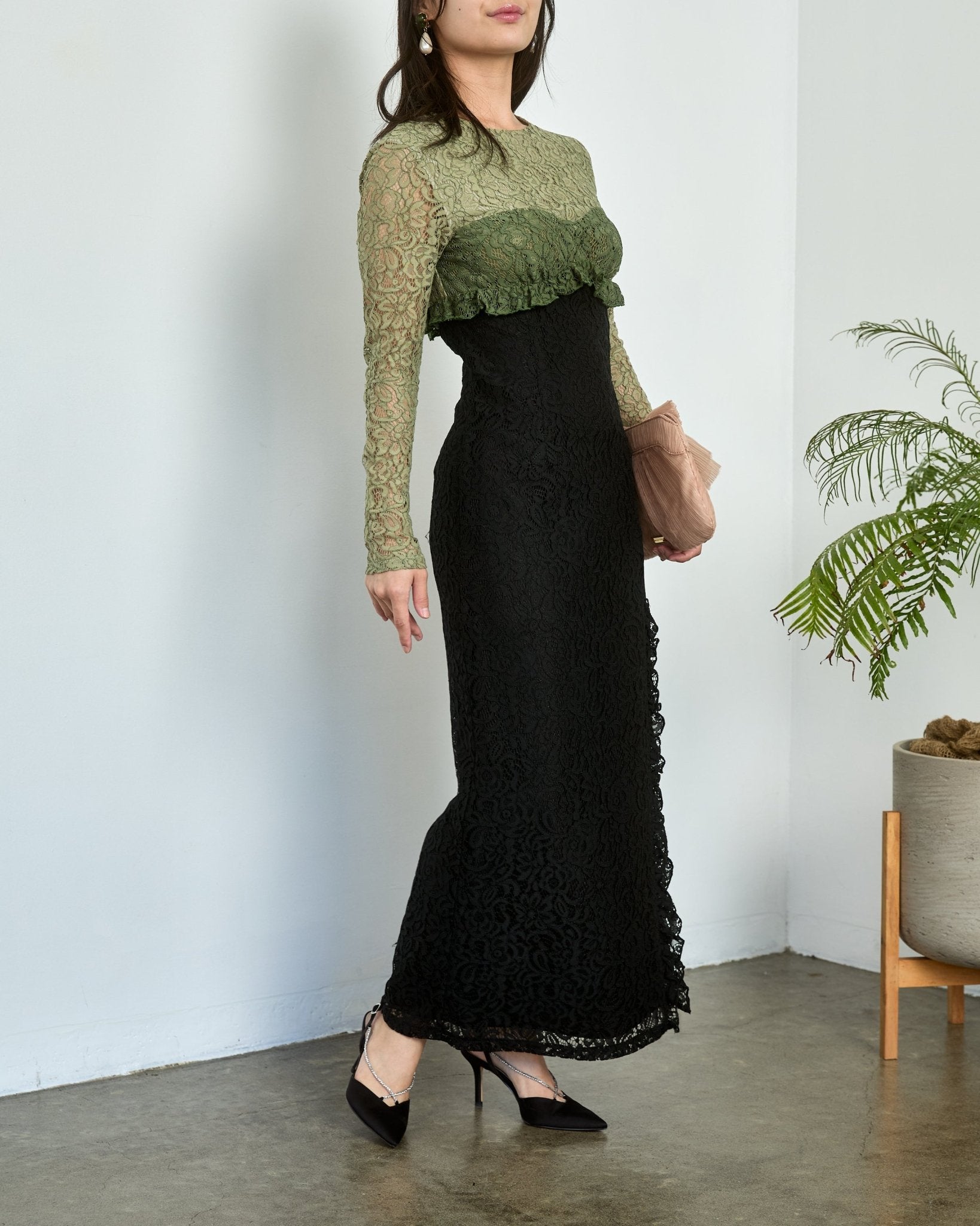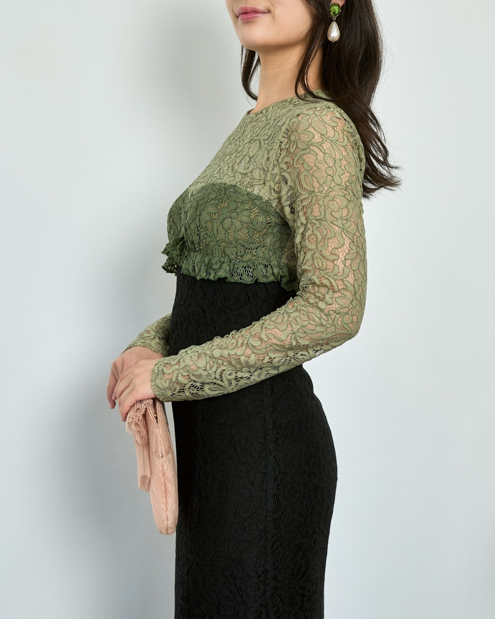 Sister Jane(シスター・ジェーン)の淡いアーミーグリーン×ブラックの配色が目を引く一着。ウエストを美しくシェイプしたIラインがスタイルアップを叶え、上品でモードな印象に。袖透け×レースの質感が大人の華やかさを演出。結婚式やディナーにおすすめ。