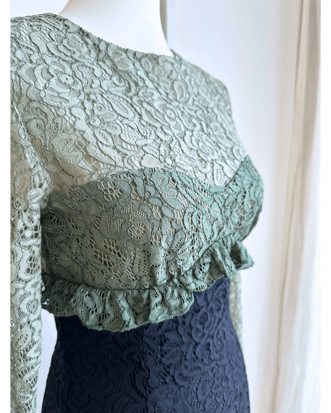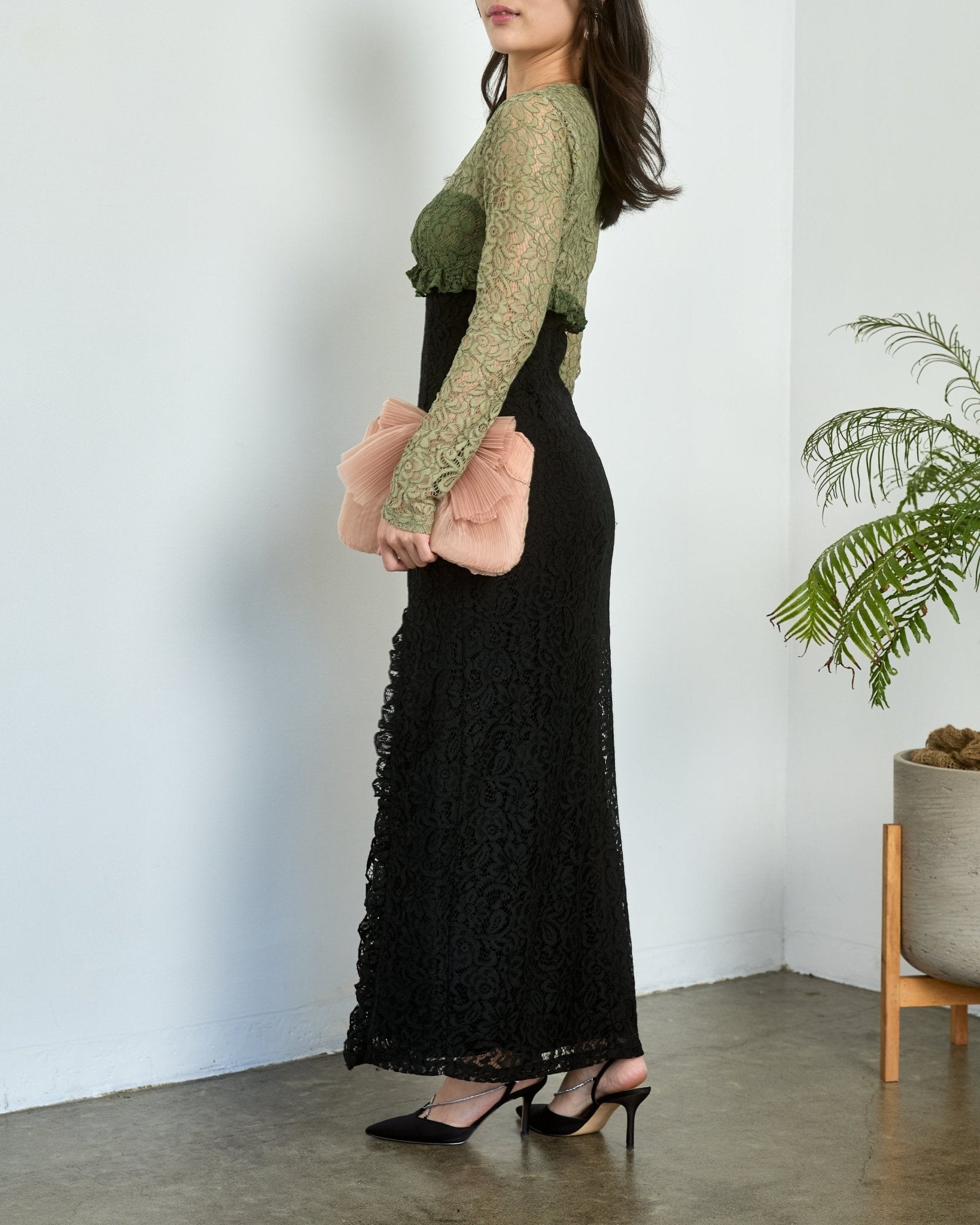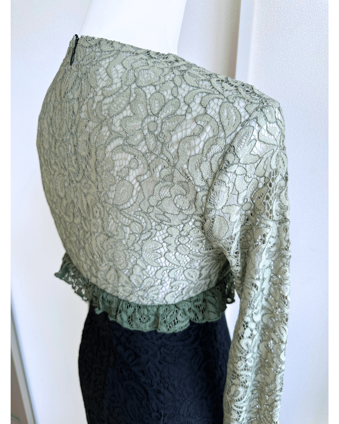 Sister Jane(シスター・ジェーン)の淡いアーミーグリーン×ブラックの配色が目を引く一着。ウエストを美しくシェイプしたIラインがスタイルアップを叶え、上品でモードな印象に。袖透け×レースの質感が大人の華やかさを演出。結婚式やディナーにおすすめ。