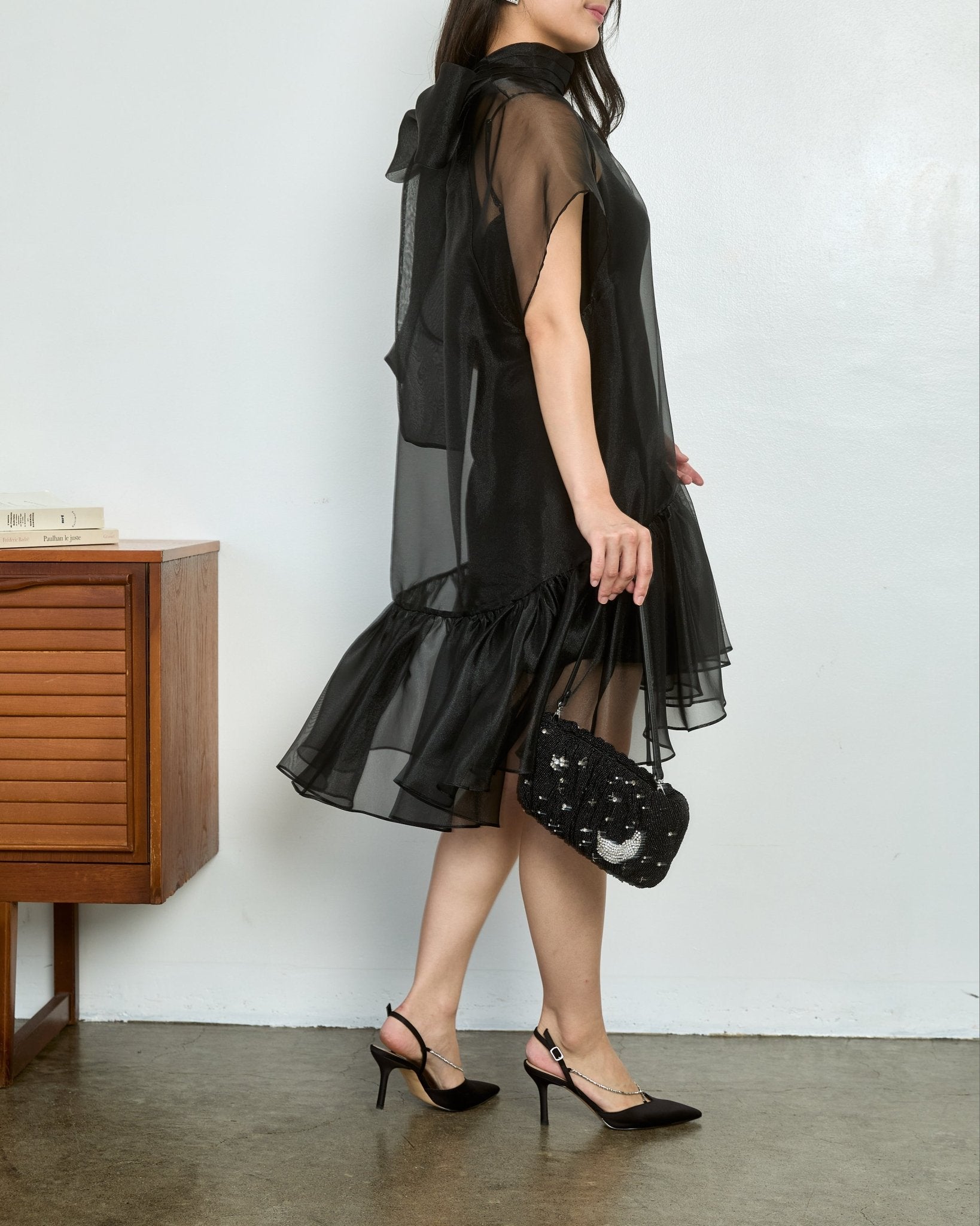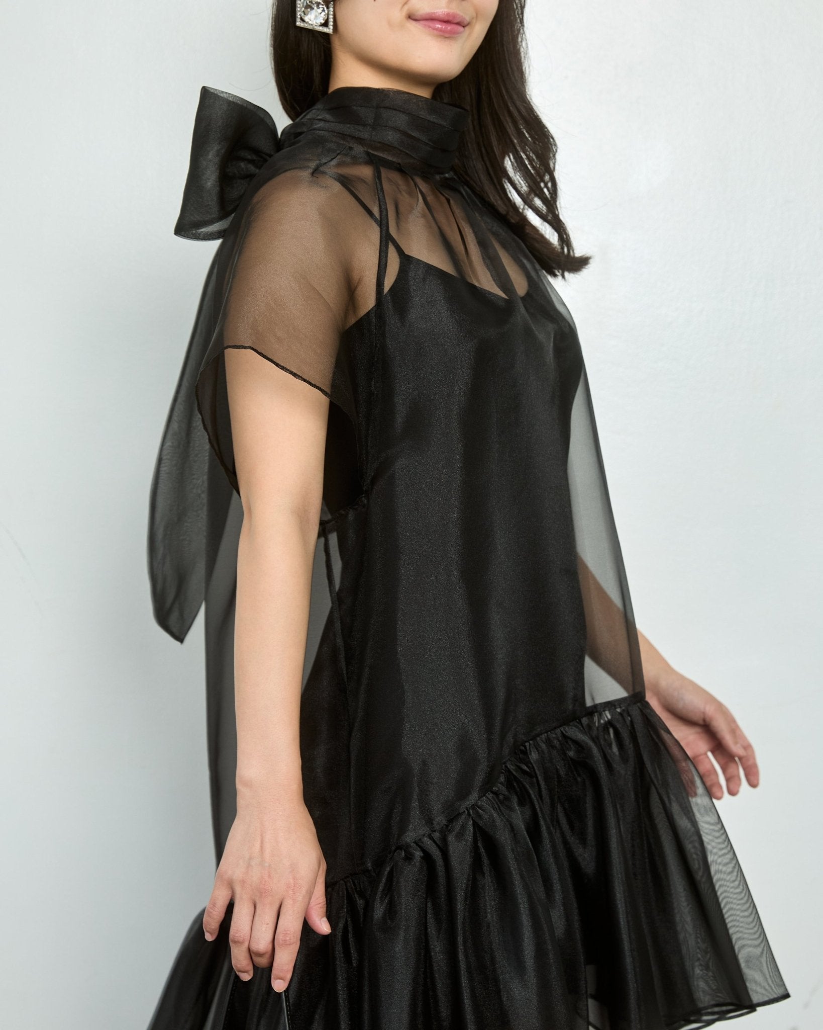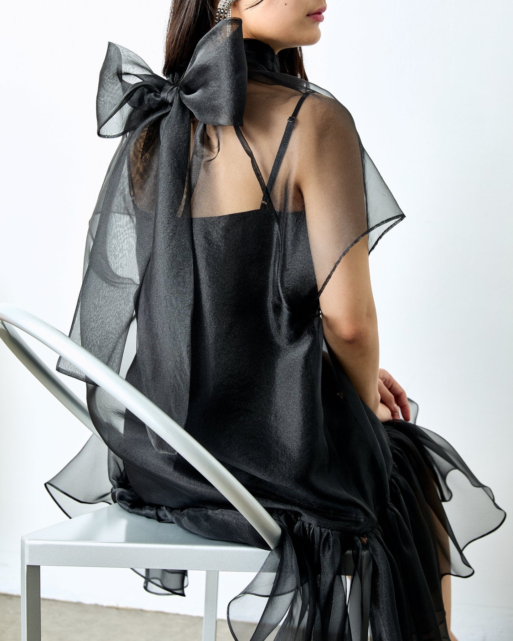- 首後ろのボタン(またはホック・金具)を外して、頭からかぶります。首後ろのリボンはご自身で結ぶ仕様です。