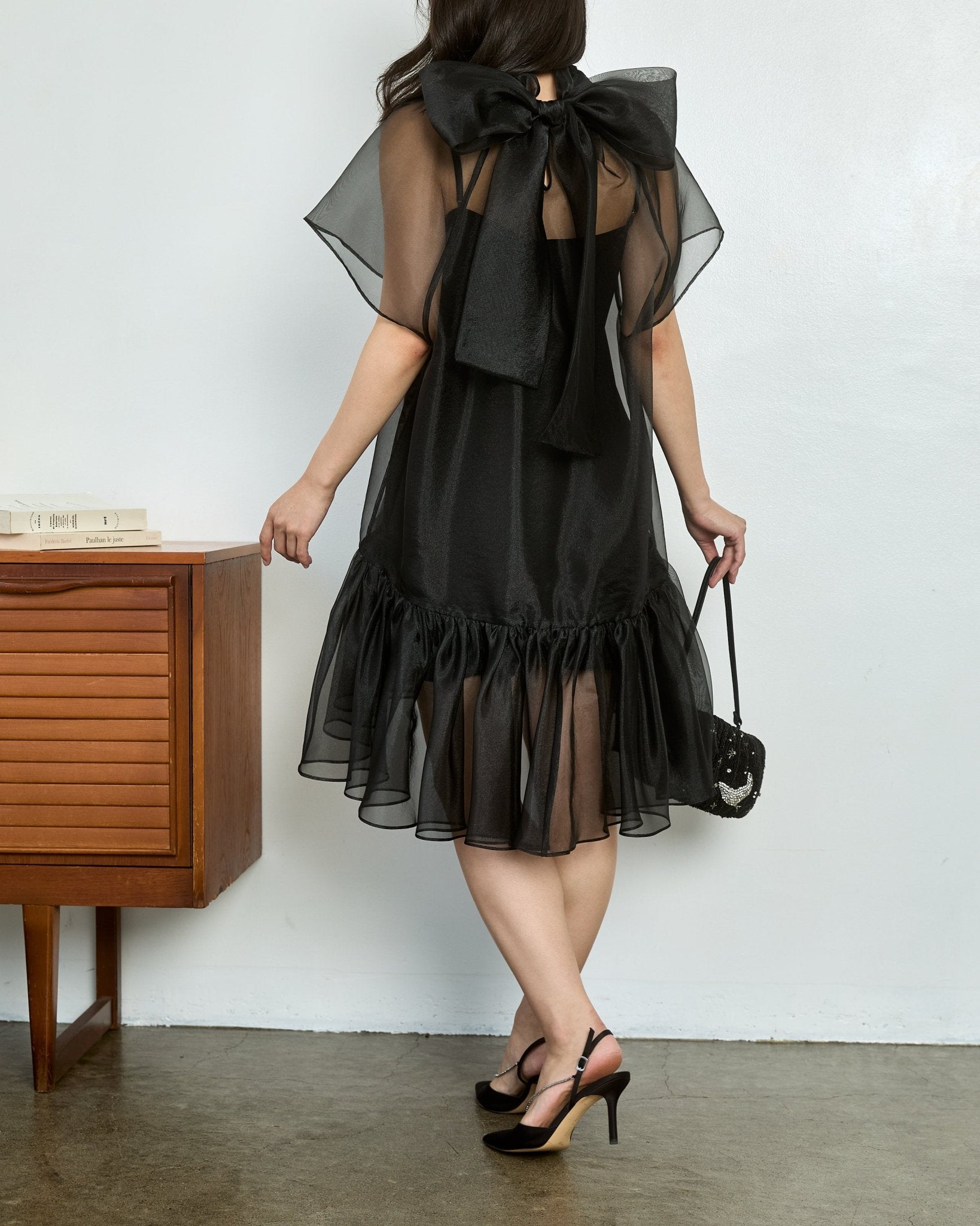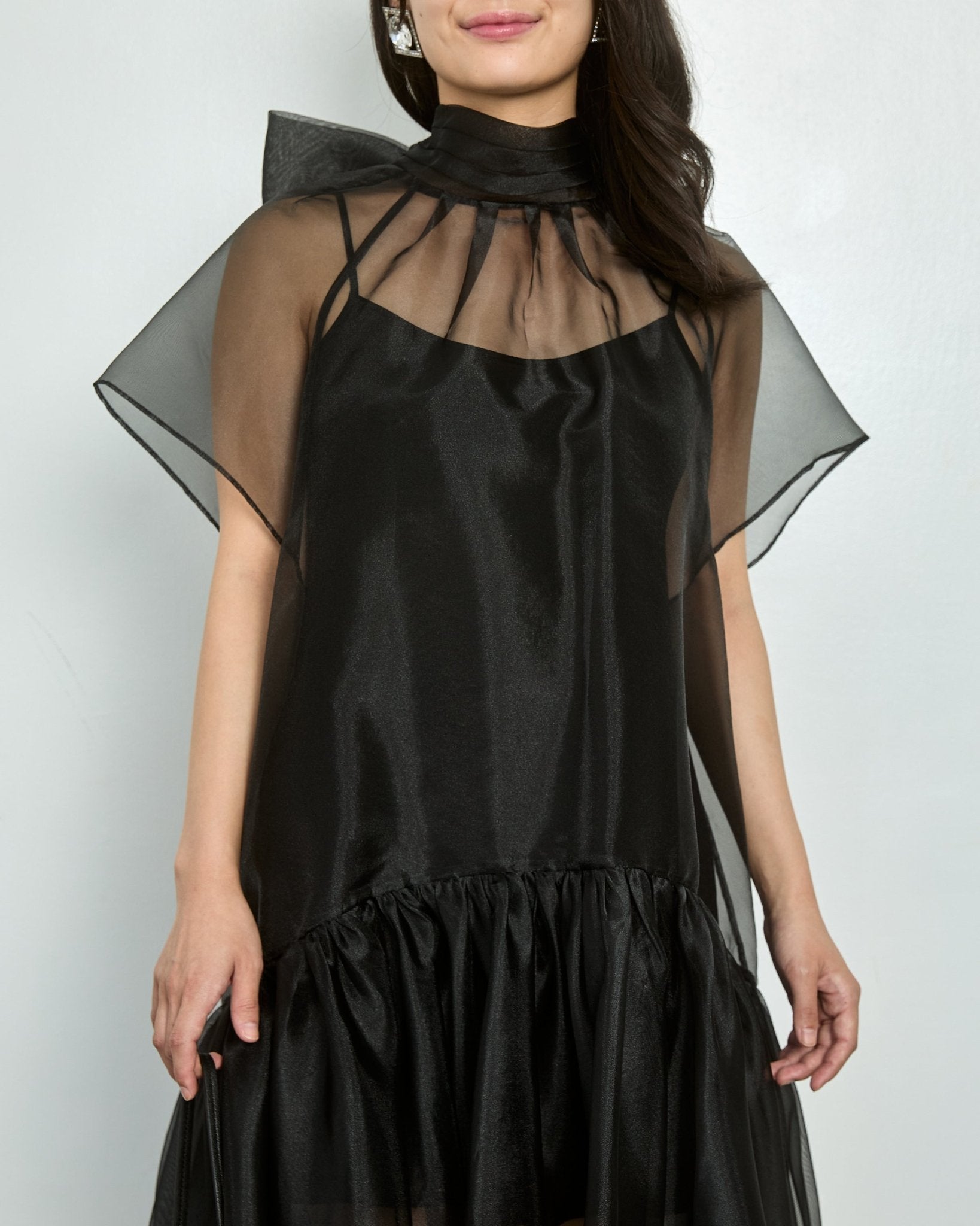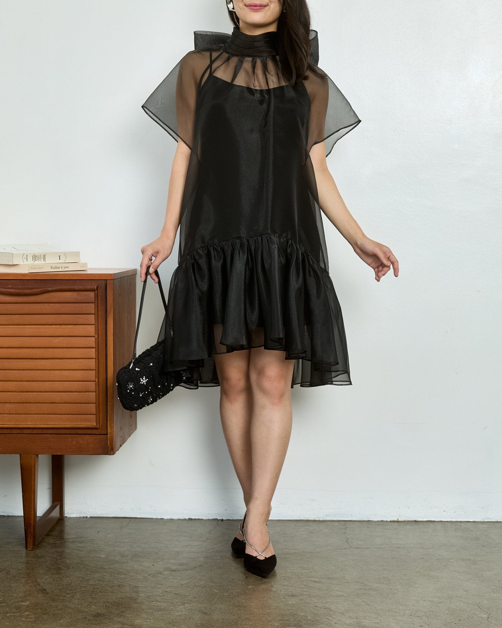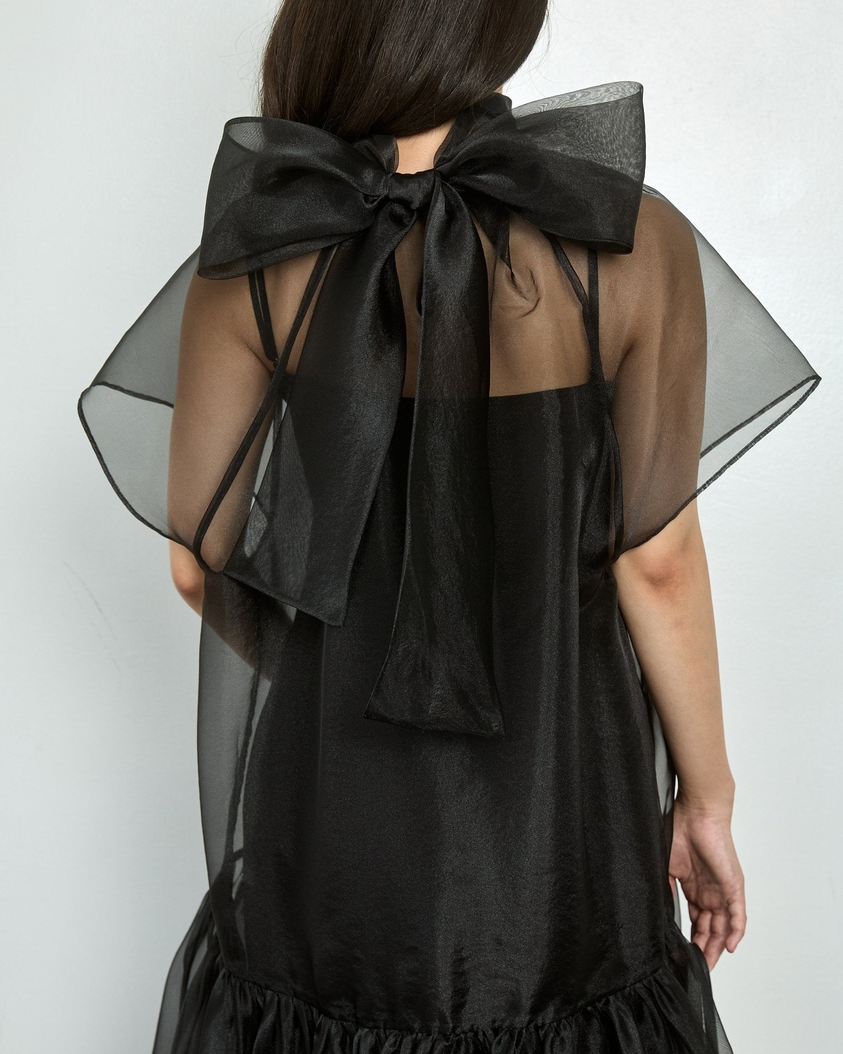 - 首後ろのボタン(またはホック・金具)を外して、頭からかぶります。首後ろのリボンはご自身で結ぶ仕様です。