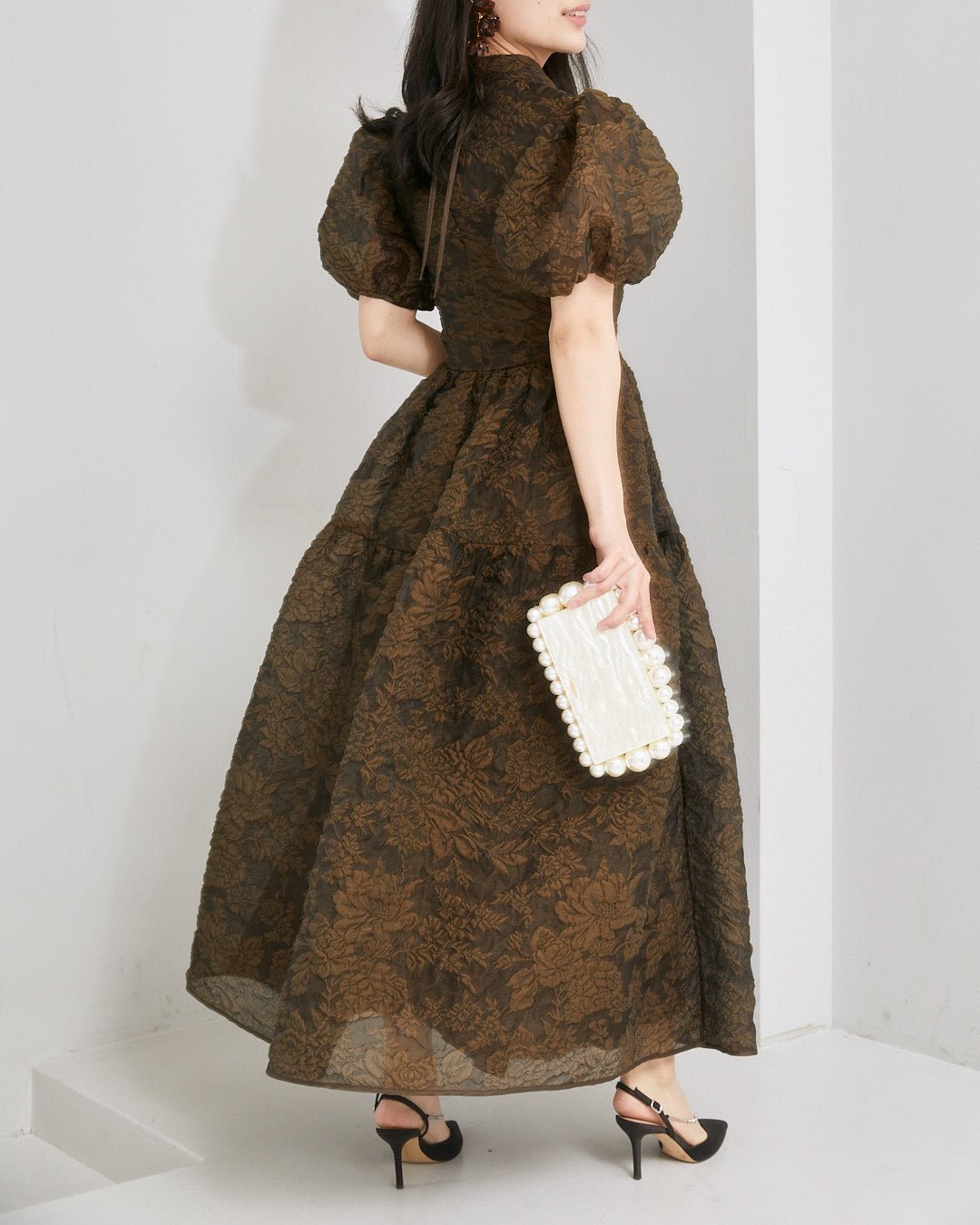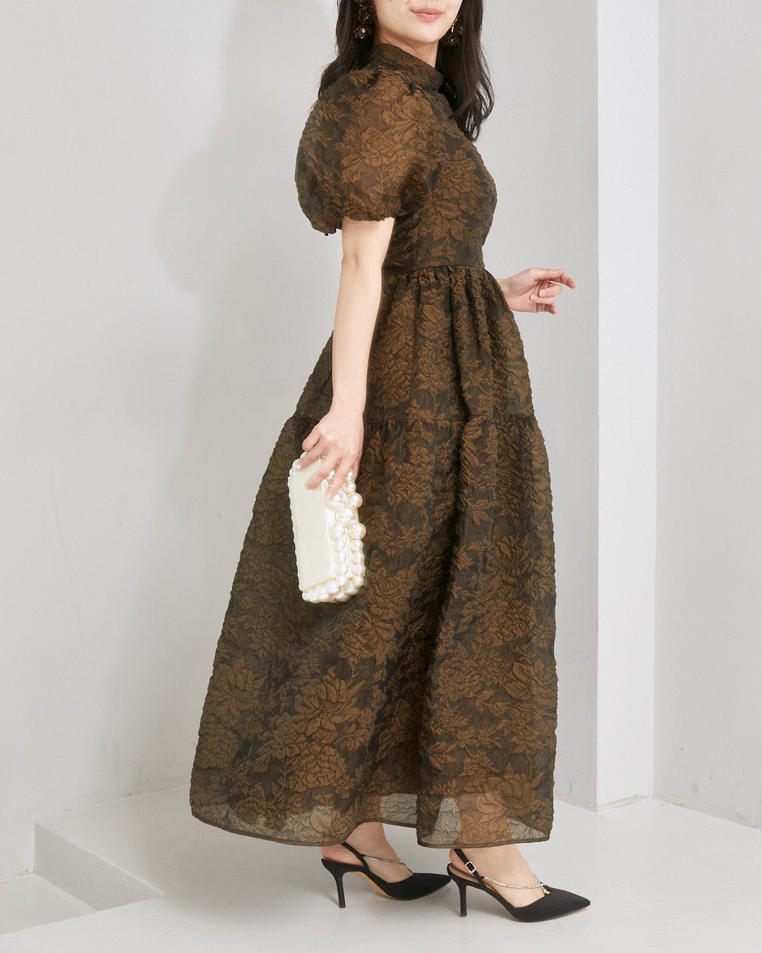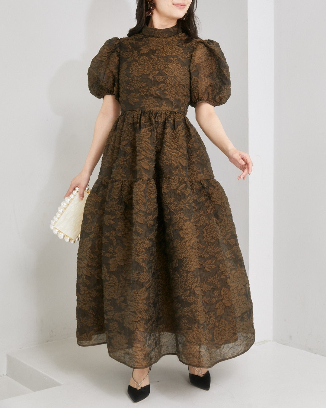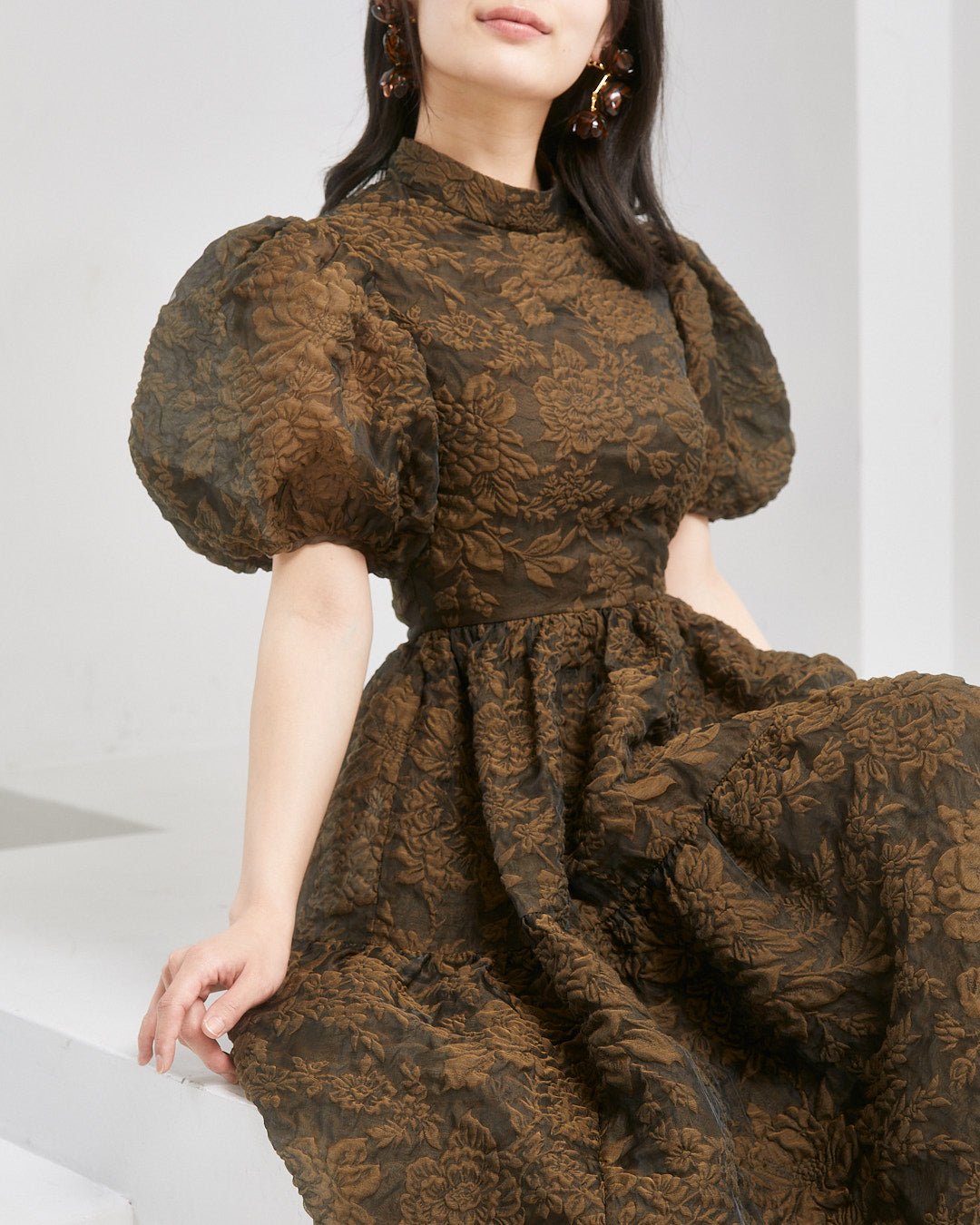ブランド特製のふっくらとした花柄キルティング生地に透け感を重ねた、ロマンチックなミモレ丈ドレス。