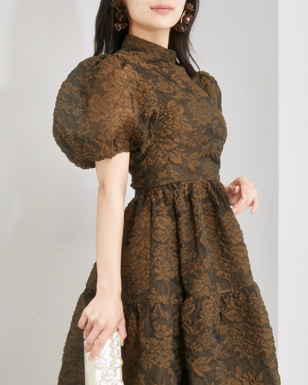 パフスリーブやハイネック、ティアードシルエットでクラシカルな雰囲気を醸し出しつつ、軽やかな透明感で夏のウェディングにも映える一着です。