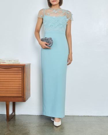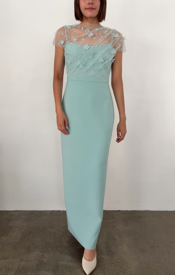 TheiaのDesirae(デジレー)columnガウンは、まさに芸術品のような豪華な装飾が施された一着。ブランド定番のストレッチクレープ素材で仕立てられ、贅沢な刺繍糸とビジュー付きチュールが華やかに彩ります。今季は、ユニークなドレープシルエットでさらに魅力を高めています。爽やかなシーブリーズカラー(淡いブルーグリーン)が上品に映える一着。