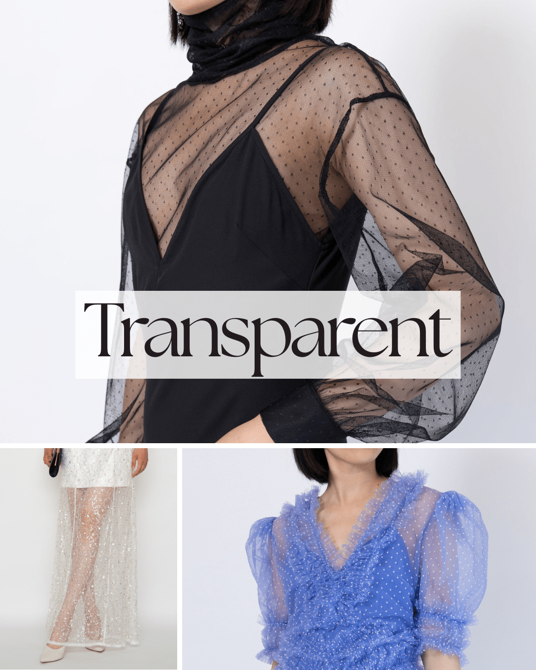 シアー素材やシースルー素材:オーガンジー、シフォン、チュール、薄手レースなど(厚手のレースで目が詰まっているとトランスペアレントな印象は弱くなる)