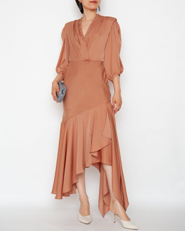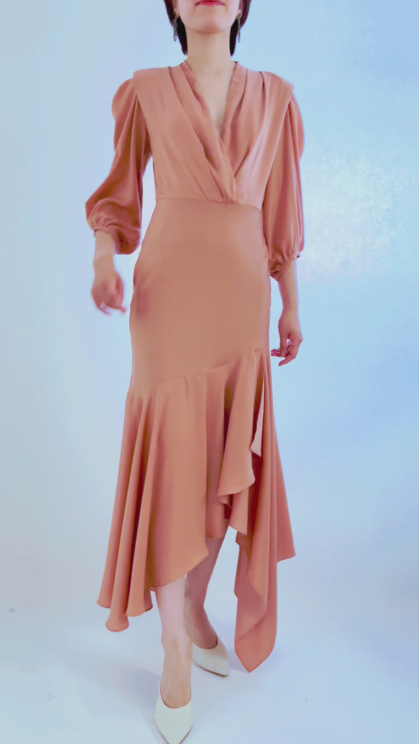 ハンマード サテン アシンメトリーヘムドレス(アプリコット、大きめS~M相当)