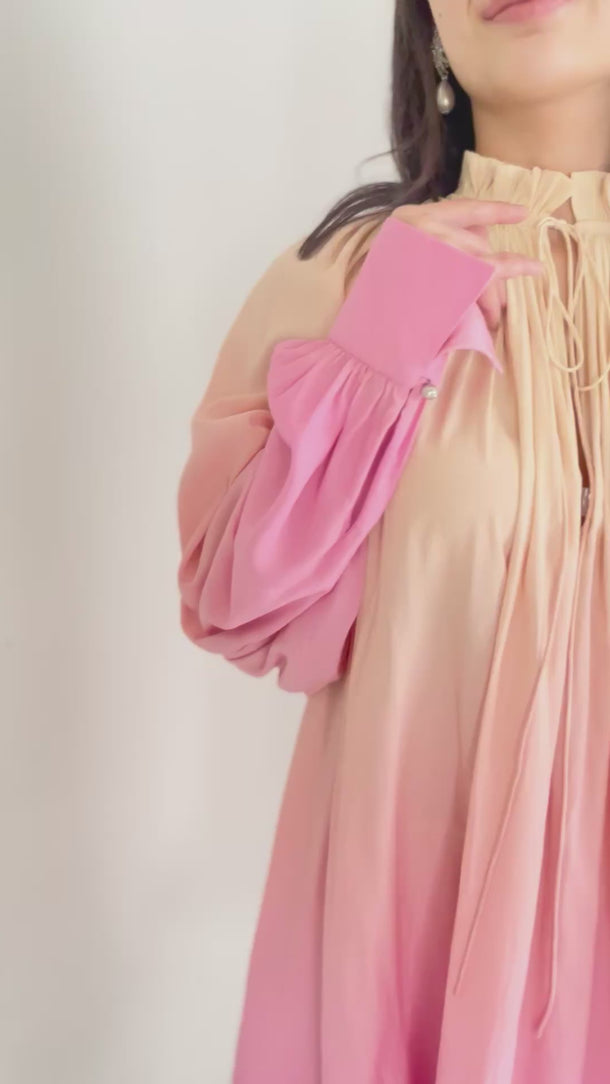 - 頭からかぶります。首元のリボンはご自身で結ぶ仕様です。袖口にボタンがあります。