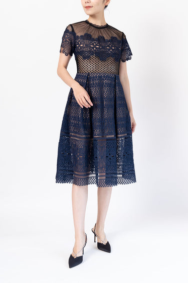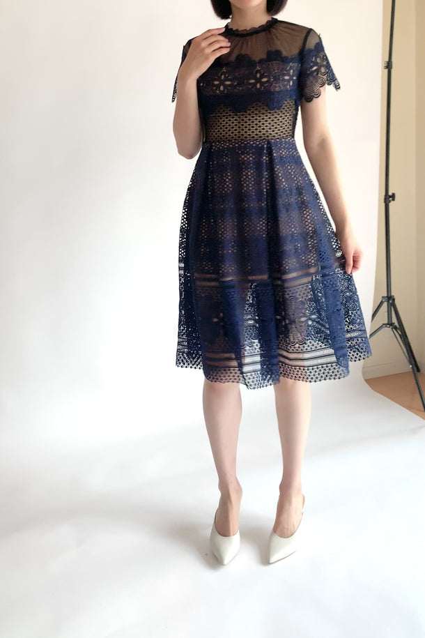 Self-Portrait(セルフ・ポートレート)の半袖ひざ丈ドレス。チュール素材に大小のレース模様が組み合わさり、ネックライン、袖口、裾の波模様が可憐な印象。清楚なネイビーで肌が透け、ダークな魅力も感じさせます。上半身はベージュの生地でバスト部分がシースルー、スカートはミニ丈で足が透けて見えるデザイン。昼のパーティーにぴったりです。